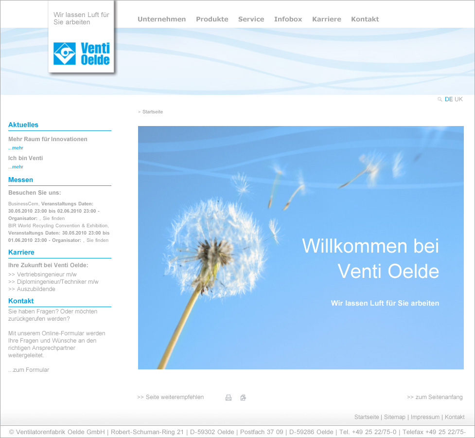 The clear structure and a new comfortable menu navigation will direct the visitor quickly to the requested information of which there is now a lot more. The first stage has brought an increase in the information volume on the website of more than 150%. In the second stage, show the tremendous which will diversity of Venti Oelde’s products by the examples of specific solutions, an increase in information density by a factor of 10 is expected. This second stage is due to be launched mid 2011 at the earliest.