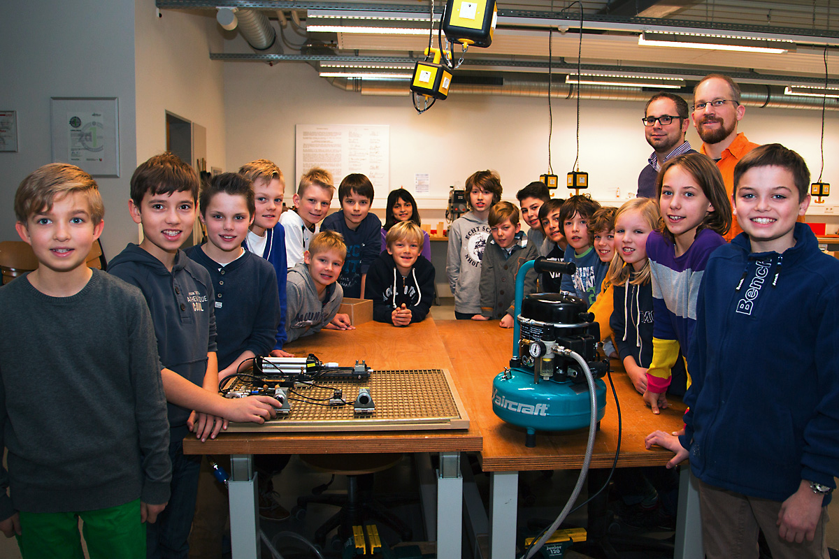 Venti Oelde has donated a compressor for the technology lab of the Thomas More Grammar School in Oelde as a replacement for the out-of-date equipment which was so extremely loud that it interrupted lessons. In accordance with the Venti company slogan, “We make air work for you”, the compressor generates compressed air for pneumatic parts made by the students. Some of the year five students, acting for their older fellow pupils, accepted the compressor. The photo shows them with their teachers, Benedikt Große Frie (left) and Dirk Hanke, with a model which illustrates the principle of pneumatics.