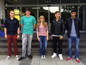 The photo shows (from left to right) David Roggenland (Industrial management assistant), Sebastian Wille (Technical product designer), Vanessa Holthöfer (Industrial management assistant), Cagri-Burak Özyurt and Can Claud Görgü (both mechinists).