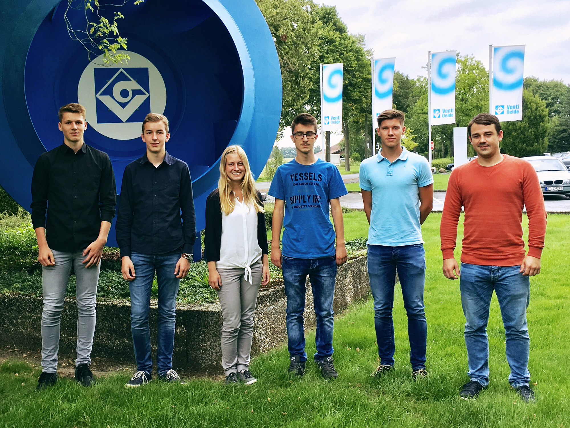 Six young people began their careers on August 15th, 2017, at Venti Oelde. During their training to become industrial management assistants, technical product designers and industrial machinists, all of which last several years, they will become acquainted with the tasks, while working through the various departments in production, engineering and administration. Management and employees wish the new colleagues a good start in their working lives. The photo shows, from left to right, Owen Bartels, Paul Wößmann (both technical product designers), Melina Konert (industrial management assistant), Emre Bayram, Kevin Populoh (both industrial machinists) and Alexander Penner (industrial management assistant).