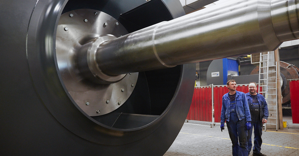 It's a shape and size that always makes you look twice – even our staff in final assembly never fail to be impressed. The impeller has a diameter of 4,800 mm, the flanged shaft a length of 11,300 mm, and each unit has an overall weight of just under 45 tons. Venti recently delivered two of these imposing rotors to keep fresh air circulating into a mine.