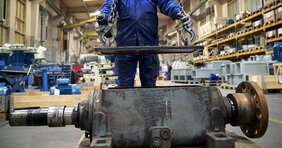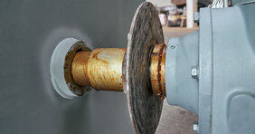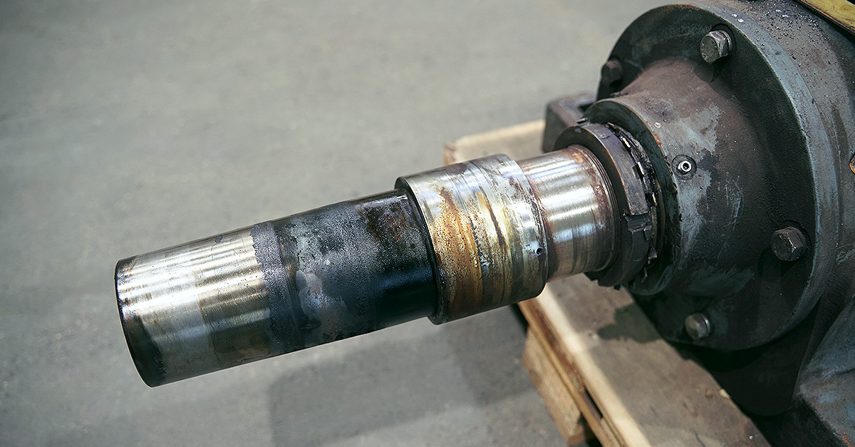 An initial inspection only showed some worn areas on the impeller blades. To get a more detailed look, the impeller with the mounted shaft was dismantled together with the block bearing and the attached coupling half. This revealed that the shaft had taken a blow and been damaged at some point in the past, so that it would need to be replaced together with the rolling bearings, feather keys and shaft protection sleeves. The newly installed shaft protection sleeve is now hard-chrome plated – which will reduce scoring and allow for a longer service life.